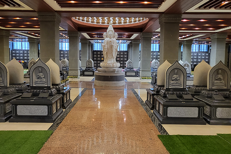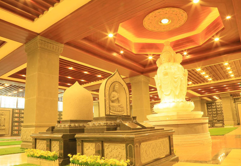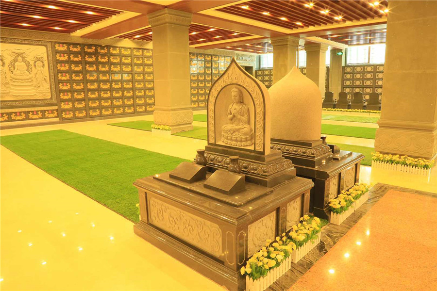 玉佛寺寝宫内部与院内布局呈请了国内著名堪舆大师现场指导,处处用心,希望有缘入住的先人福泽子孙。寝宫基地方位以“五行相生”来构建,比如在火位设焚金炉,在水位设海岛观音许愿池。寝宫中葬穴设天井承接天地之气,贯穿全场,引请诸大菩萨、庇佑护持,接引亡灵即登极乐净土。